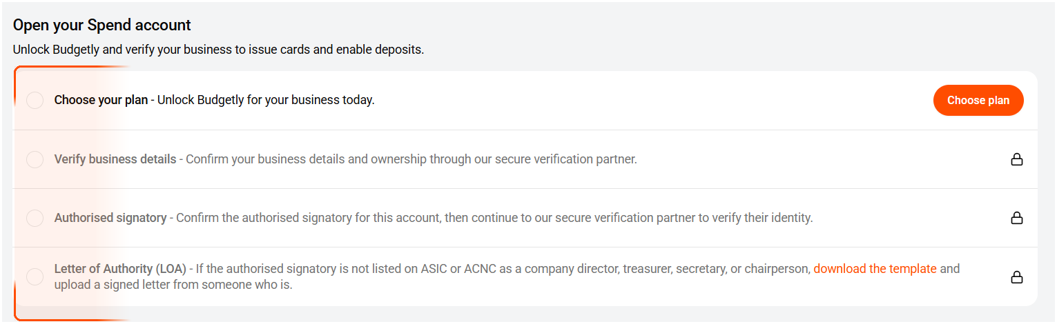 Only the authorised signatory or a Budgetly admin can complete these steps.
