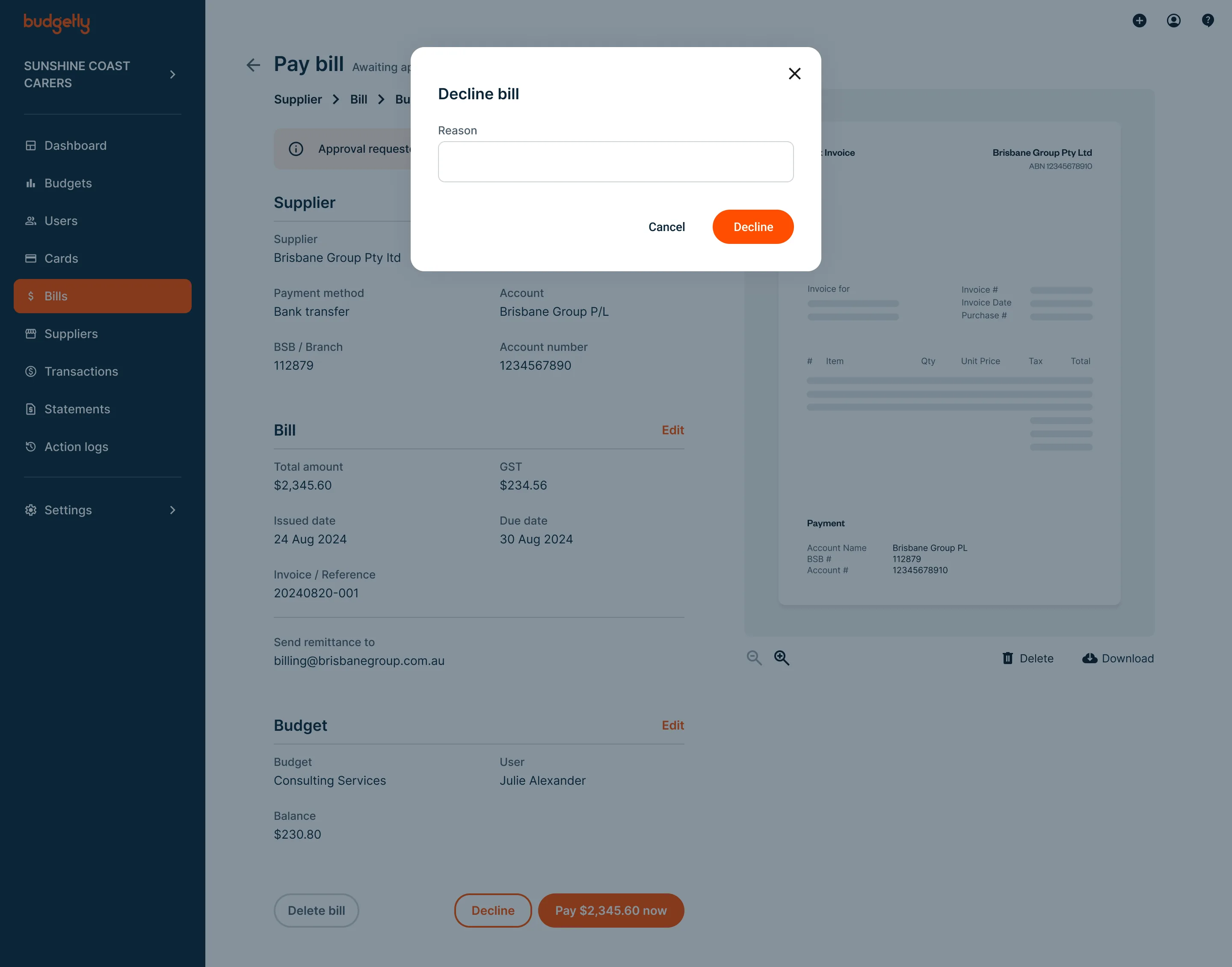 - Easily review, approve, or decline bills (with reason) directly from your dashboard.