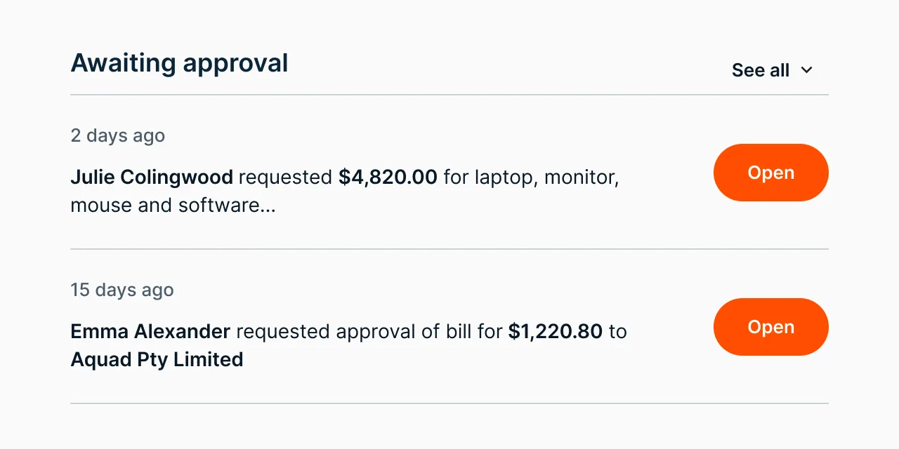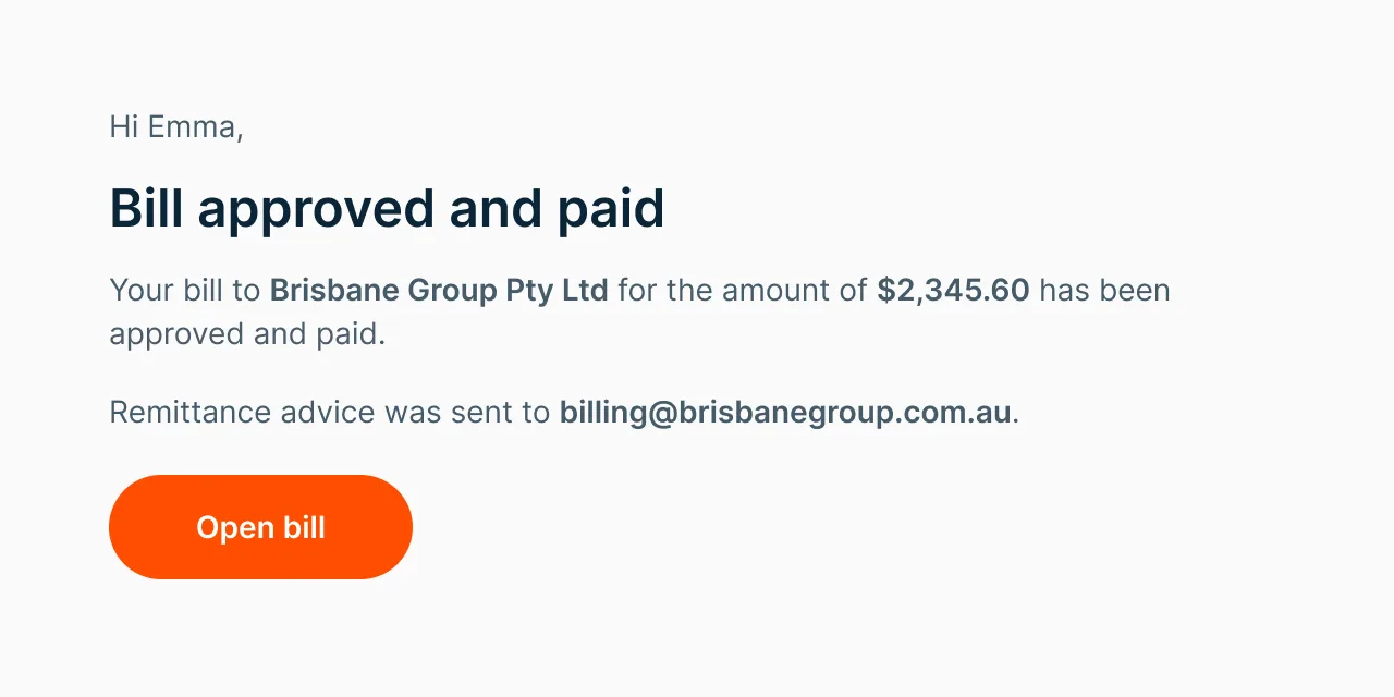 [User] requested approval of bill for [$Amount] to [Supplier].Admins are notified via email, with a direct link to review, edit, approve, or decline the bill.