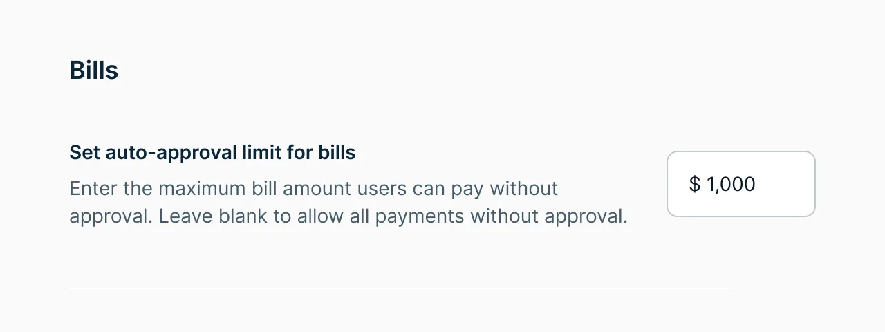 - Flexible control: Set the limit to $0 if you require admin approval for every bill. If the input is cleared, users can pay bills with no limits or required approvals.