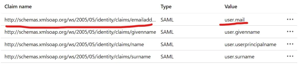 In the Attributes and Claims section, keep default values. Confirm that a Claim name “http://schemas.xmlsoap.org/ws/2005/05/identity/claims/emailaddress" and Value “user.mail” is present.