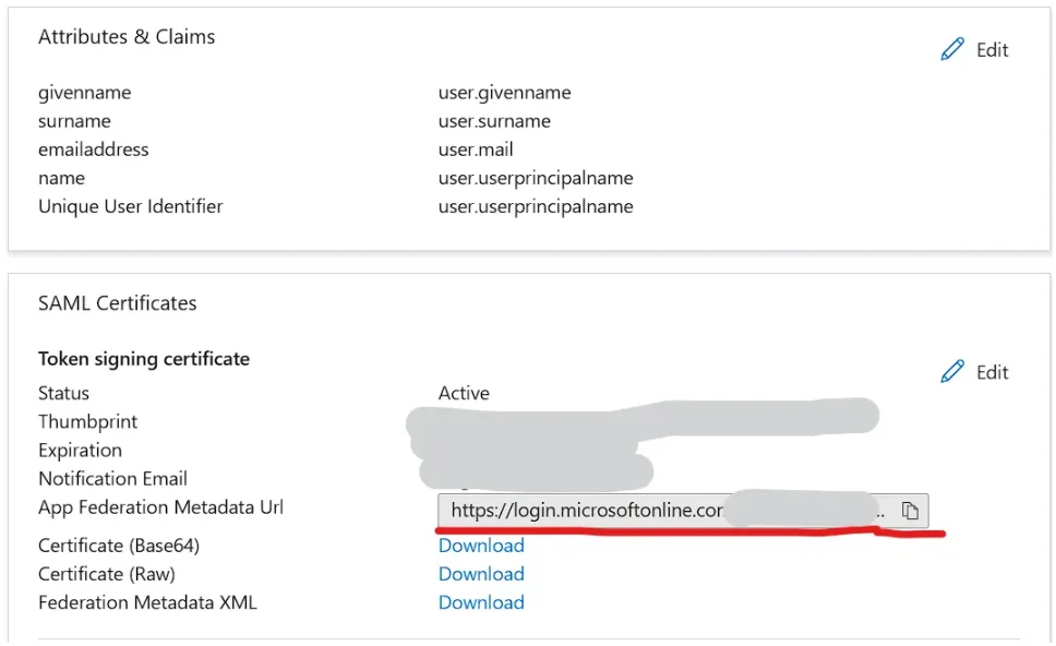 In EntraID SAML Certificates section, copy the App Federation metadata Url .
